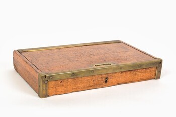 DescriptionLa boîte rectangulaire est recouverte d’un plateau coulissant qui peut être fermé avec une clé. Les coins sont renforcés avec du métal. Cette caisse portable servait pour le transport de recettes.