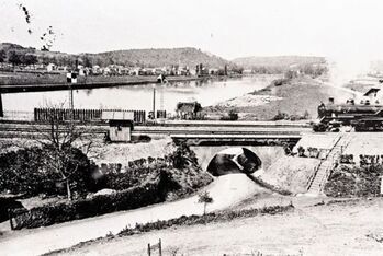 BeschrijvingReproductie van een postkaart met opschrift 'Le point d'arrêt et Panorama'. Rechts zien we de neus van een stoomtrein die aankomt in een stopplaats aan de oever van de Maas.